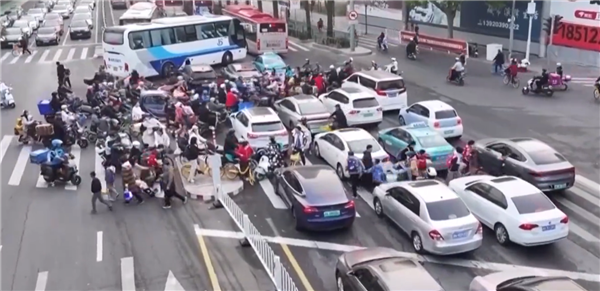 据央视新闻报道,一个早高峰,尽管已有大量由西向东的车辆堵在十字路口,后方车辆仍在努力地向前挤去,几乎阻断了南北两侧相向而来的机动车、非机动车及行人的道路,行人们只得从车辆缝隙间穿过。