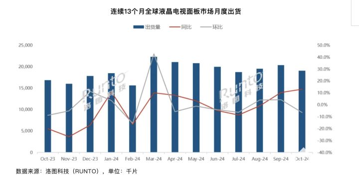 11月30号消息,洛图科技最新公布了全球液晶电视面板市场月度出货情况。2024年10月,全球大尺寸液晶电视面板出货量为19.1M片,环比9月仅下降6.5%,同比增长13.1%;出货面积为14.4M平方米,环比下降4.8%,同比增长12.3%。整体上,10月延续了9月份的同比增长趋势。