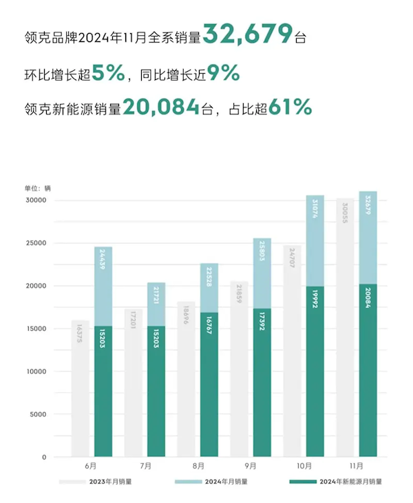 快科技12月2日消息,领克汽车11月销量数据出炉,全系销量达到32679台,同比增长近9%,环比增长超5%,创下历史新高。
