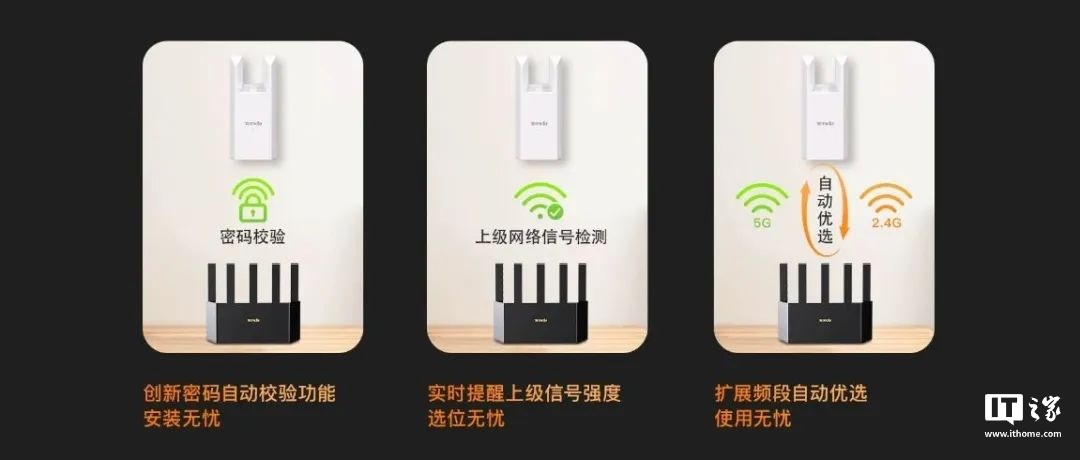 安装方面,手机或 PC 设备连接扩展器信号后即可自动弹出配置页面,一次操作即可快速完成两个无线频段的自动扩展。若使用有线扩展模式,插上网线并设置无线密码后,即可实现上网。