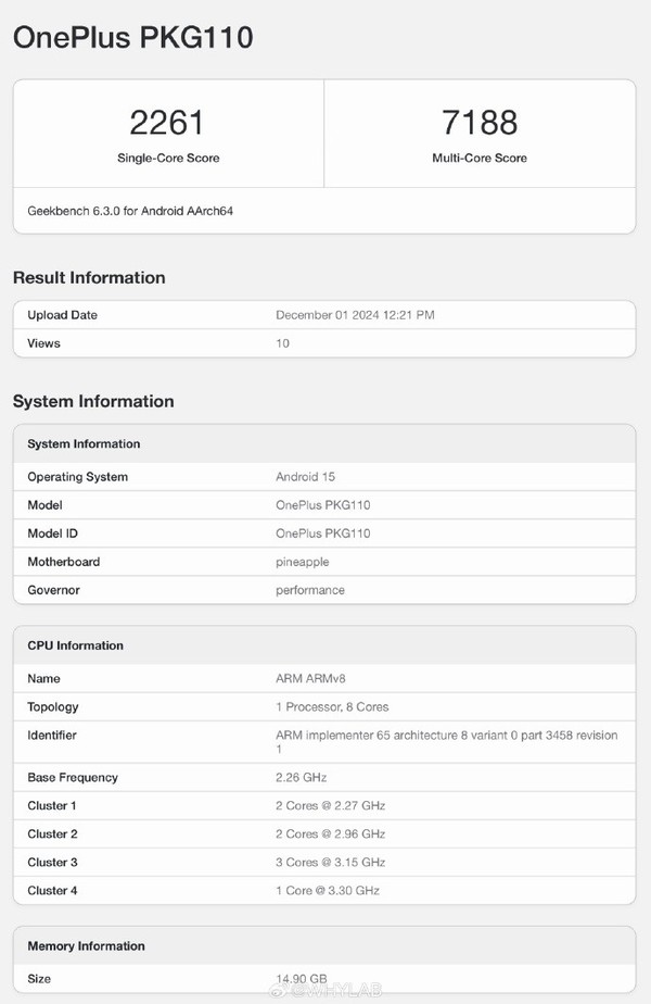 【CNMO科技消息】一加Ace 5系列已宣布将于本月面世,包含Ace 5及Ace 5 Pro两款产品。12月2日,CNMO注意到,一加Ace 5在Geekbench跑分平台上现身,型号为PKG110,搭载的是骁龙8 Gen3移动平台,单核得分2261,多核得分7188。