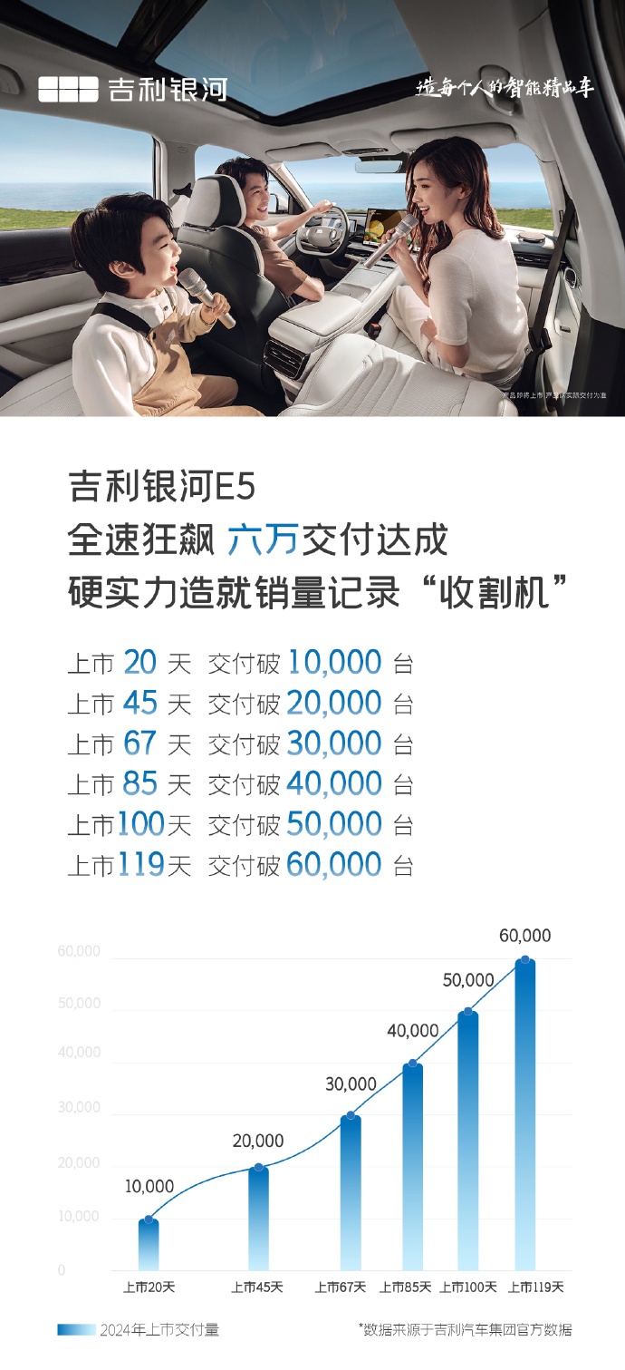 IT之家 12 月 2 日消息,吉利银河新能源今日宣布,银河 E5 纯电 SUV 上市 119 天达成六万交付: