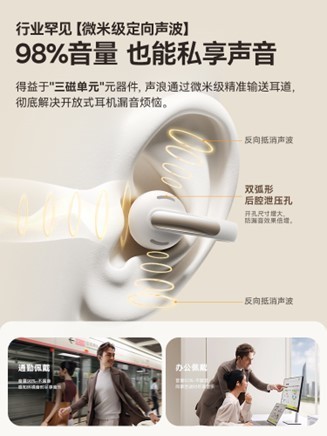 为了满足用户的沉浸体验和隐私保护需求,倍思MC1耳夹耳机打造专属佩戴私有体验空间。声音输出上,耳机搭载逆声场消音系统和微米级定向传音技术,通过逆向声波减少漏音,实现定向传音;尤其是双弧形后腔泄压孔的独特设计,开孔尺度增大,让防漏音效果获得倍增,彻底解决开放式耳机漏音问题,无论在通勤路上或者办公室内,感知环境音也能尽享音乐。而在收音表现上,融合训练样本数量近3000万的深度神经网络算法(DNN),同时配载AI通话降噪,精准拾取人声,置身喧嚣也能通话更清晰。