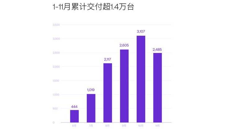 9月,极越汽车销量2605辆,10月,极越汽车销量3107辆,11月,极越汽车销量2485辆。从销量走势上看,这意味着,在10月和11月的利好期里,几乎所有新势力都收获了国庆假期以及广州车展的红利,极越汽车却发生了销量滑坡。