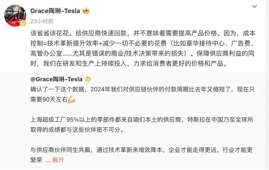 一时间,价格战后供应商的生存问题成了行业的又一焦点。在比亚迪说明“降本要求”实为议价,吉利、博世高管纷纷辟谣“刀片是私人关心”的背景下,一向不关注国内汽车市场舆论的特斯拉站出来发声了: