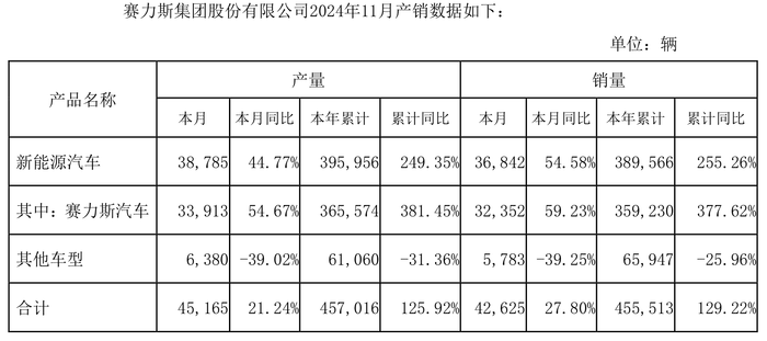 不止如此,赛力斯(601127.SH)也进行了披露,公司称,11月里新能源汽车的产销数据分别为3.8785万辆和3.6842万辆,1-11月累计销量则达到了38.9566万辆,累计同比增幅255.26%。若算上其他车型,1-11月累计销量为45.5513万辆,同比增幅129.22%。赛力斯称最终数据以2024年审计数据为准。