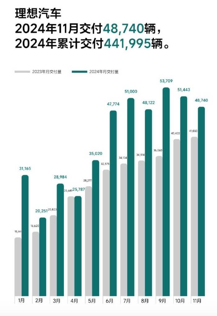 理想汽车也同样在微博上表示,2024年11月,理想汽车交付新车4.874万辆,同比增长18.8%。截至2024年11月30日,理想汽车2024年共交付44.1995万辆,历史累计交付量为107.5359万辆。“在20万元以上乘用车市场,理想汽车连续8个月获得中国品牌销量冠军,今年8月至10月连续3个月超过奥迪、宝马在中国市场的销量。理想L6累计交付量突破16万辆,自6月起蝉联20万元以上中国品牌汽车销量第一。”截至2024年11月30日,理想汽车在全国已有475家零售中心,覆盖141个城市;售后维修中心及授权钣喷中心451家,覆盖223个城市。理想汽车在全国已投入使用1135座理想超充站,拥有5680个充电桩。