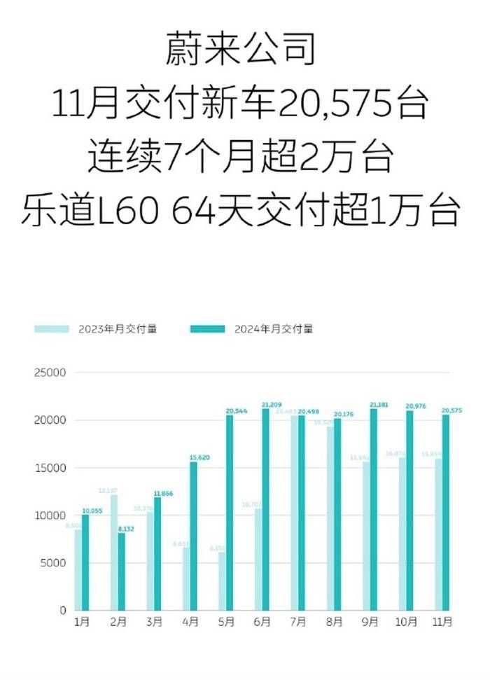 另外,根据蔚来的官方微博,公司11月交付新车2.0575万台,连续7个月超2万台。2024年1-11月,蔚来公司共交付新车19.0832万台,同比增长34.36%。截至目前,蔚来公司已累计交付新车64.0426万台。蔚来品牌的话,11月共交付新车1.5493万台;今年1-11月,蔚来品牌共交付新车18.0599万台,同比增长27.16%。截至目前,蔚来品牌已累计交付新车63.0193万台。阿联酋当地时间11月28日,蔚来中东与北非地区首家蔚来中心在阿布扎比正式开业。