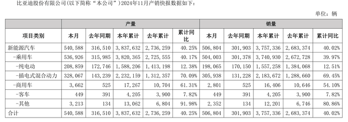 比亚迪(002594.SZ)公告,11月的新能源汽车产量54.0588万辆,销量50.6804万辆,销量已累计至375.7336万辆,累计同比增幅40.02%。比亚迪强调,公司2024年11月海外销售新能源乘用车合计3.0977万辆,其中出口2.8141万辆;2024年11月新能源汽车动力电池及储能电池装机总量约为22.472GWh,2024年累计装机总量约为171.210GWh。