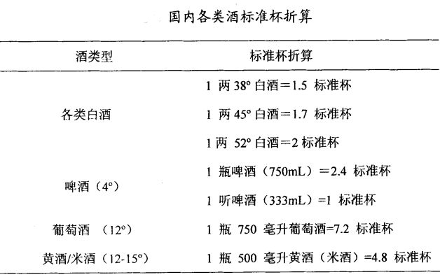 æ ¹æ®WHOæ ‡å‡†ï¼Œé’ˆå¯¹é…’ç²¾ä½¿ç”¨é‡é‡‡ç”¨é…’ç²¾æ ‡å‡†æ¯è¡¡é‡ï¼Œå°†æˆ‘国常饮å„ç±»åž‹é…’çš„é¥®ç”¨é‡æ¢ç®—ä¸ºé…’ç²¾æ ‡å‡†æ¯ï¼Œå¸¸ç”¨å…¬å¼ä¸ºï¼šlæ ‡å‡†æ¯=10克纯酒精;1æ ‡å‡†æ¯=饮酒é‡(毫å‡)×酒精度数(ï¼…)×0.08。