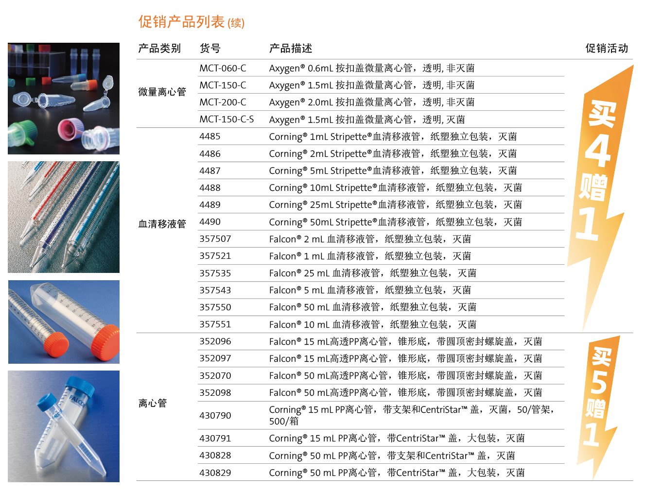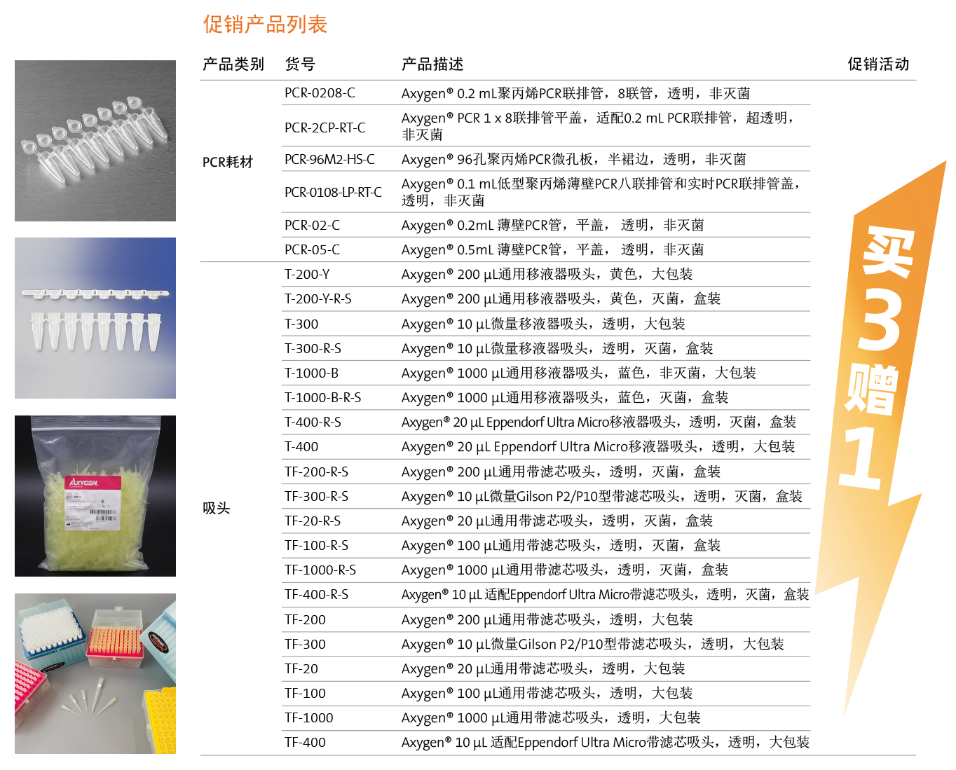 促销期间,促销列表中的PCR耗材和吸头买三赠一;微量离心管和血清移液管买四赠一;离心管买五赠一。同货号产品可累计,多买多赠。