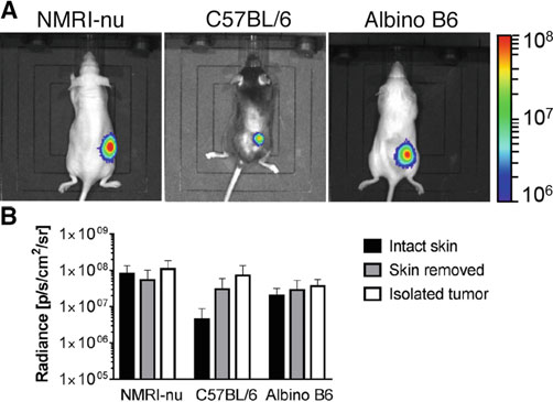 未剃毛的C57BL/6å°é¼ 皮下肿瘤的生物å‘光信å·å¼ºåº¦æ¯”æ¤å…¥åˆ°Albino B6或NMRI Nudeå°é¼ 上的相似肿瘤信å·ä½Žã€‚(Liesa-Marie Schreiber et al.,2019)