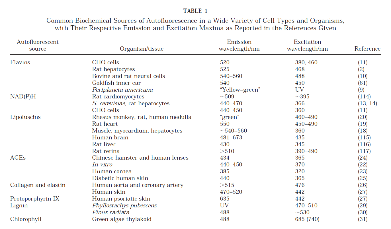 自å‘è§å…‰æ¥è‡ªäºŽç»“æž„æˆåˆ†ï¼Œä»Žå°åˆ†å到更大的结构。生物的自å‘è§å…‰å³°å€¼ä½äºŽ500nmå·¦å³ï¼Œä¸»è¦ç”±æ¯›å‘ã€çš®è‚¤ã€è‚Œè‚‰ã€è¡€çº¢è›‹ç™½ç‰å¼•èµ·ã€‚ä½¿ç”¨è¿‘çº¢å¤–å…‰æºæ¿€å‘å°åŠ¨ç‰©æ´»ä½“æˆåƒï¼Œå¯ä»¥é¿å¼€è¿™äº›è‡ªå‘è§å…‰å¹²æ‰°ï¼ŒèŽ·å¾—æ›´é«˜çš„ä¿¡å™ªæ¯”çš„å›¾åƒã€‚