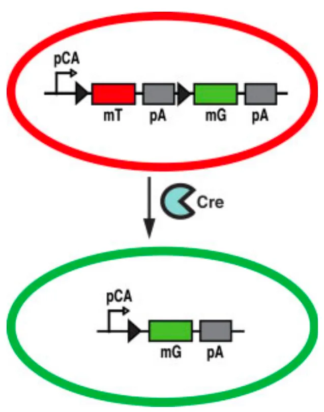 用途:用于区分Cre重组酶活性前后的细胞,通过红绿荧光的转换可以直观地显示Cre重组酶的作用。