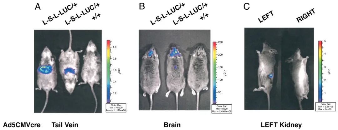 6. 生物发光 Rosa26-LSL-Luciferase描述:Rosa26-LSL-Luciferase小鼠在Rosa26位点插入了一个由loxP位点包围的STOP序列,该序列下游是荧光素酶 (luciferase) 基因。在Cre-loxP系统介导下,实现对Cre重组酶表达的检测与定位。用途:Cre重组酶不存在时,STOP序列阻止荧光素酶基因的表达。Cre重组酶表达时,Cre重组酶识别loxP位点并切除STOP序列,使荧光素酶基因得以表达。荧光素酶催化底物荧光素发生氧化反应,产生生物发光,可通过生物发光成像技术进行检测。
