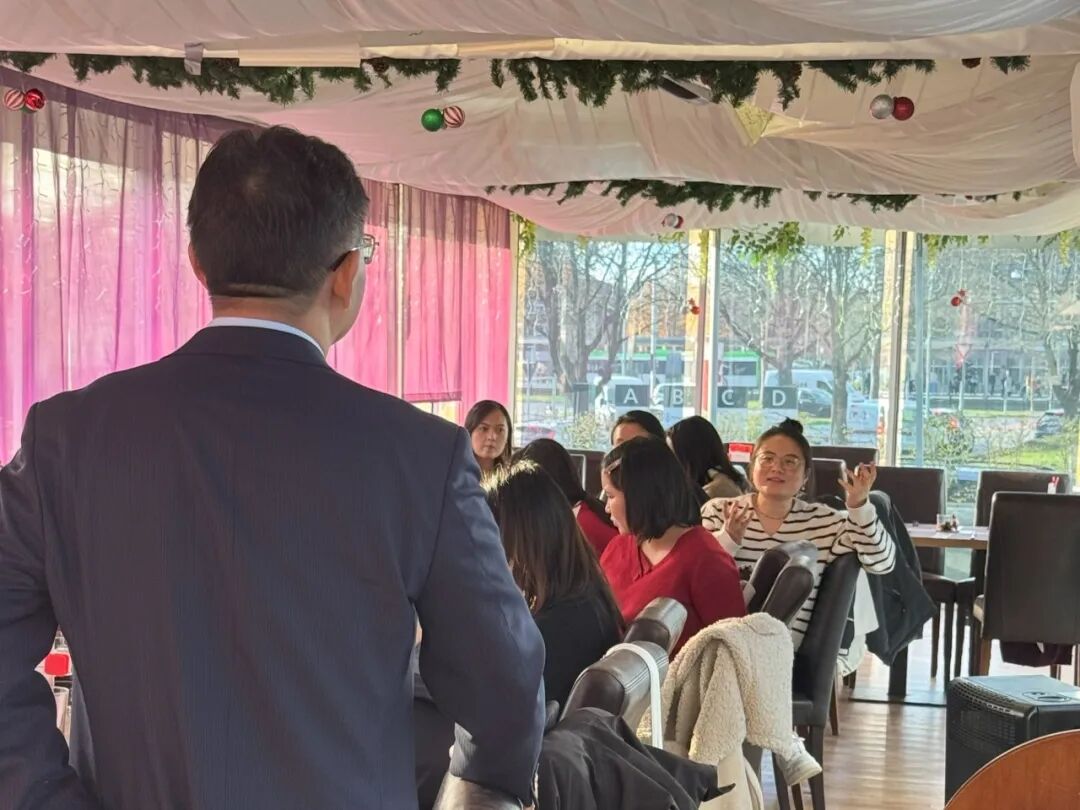 11月29日,郑加麟院长率团在德国汉诺威邀请旅德学生学者进行午餐宣讲会,吸引了超过三十多位学生学者参会。宣讲会上,郑加麟院长介绍了同济医学的历史、现状、发展规划以及招聘岗位等,重点介绍了学院和各附属医院的招聘需求,详细介绍了人才引进政策,包括薪资待遇、培养计划、科研平台等方面的优势。