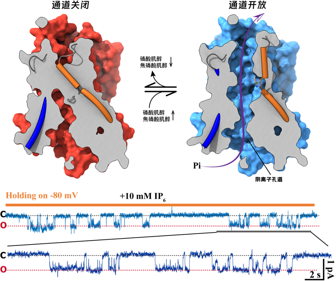 除解析了XPR1识别焦磷酸的结构基础之外,本研究还通过电生理的方法,首次表明XPR1实际上是作为磷酸通道发挥生物学作用,并非此前认定的转运体蛋白。结合结构生物学与功能生物学的研究结果,本论文提出XPR1是一个焦磷酸肌醇门控的磷酸通道,是细胞用于感知磷酸代谢信号并做出磷酸外排应答的双功能分子机器。这一研究为人们理解磷酸代谢与磷酸稳态维持的细胞生物学机制提供了结构基础,并为探索相关钙化疾病的分子病理提供的指导与见解。