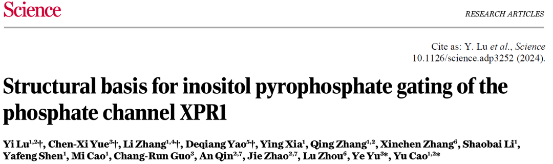2024年11月15日,上海交通大学医学院附属第九人民医院曹禹团队联合中国药科大学于烨团队在《科学》(Science)杂志上正式发表了题为“Structural basis for inositol pyrophosphate gating of the phosphate channel XPR1(磷酸通道XPR1受肌醇焦磷酸门控的结构基础)”的研究论文。该论文利用最新的冷冻电镜技术结合电生理研究方法在近原子水平上对磷酸外排分子系统XPR1进行了全面结构表征与功能分析,不仅揭示了细胞感知磷酸水平和释放磷酸这两个重要生物学途径的基本原理,还首次发现XPR1是一个高效的磷酸阴离子通道,能够被多磷酸肌醇以“双重结合”的方式激活并产生跨膜外向磷酸电流。