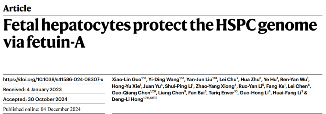 北京时间2024年12月5日,基础医学院洪登礼研究员团队在国际顶尖学术期刊Nature在线发表了题为“Fetal hepatocytes protect the HSPC genome via fetuin-A”的研究论文。该研究首次揭示了胚胎发育组织保护其干细胞基因组的机制,并证明该机制与发育疾病(如儿童肿瘤)的发生密切相关。本科研成果将为进一步研究发育疾病的发病学和预防医学提供重要的理论和实验指导;基于所揭示的机制和申请的专利,可以研发预测和预防儿童白血病发生的试剂盒或药品。