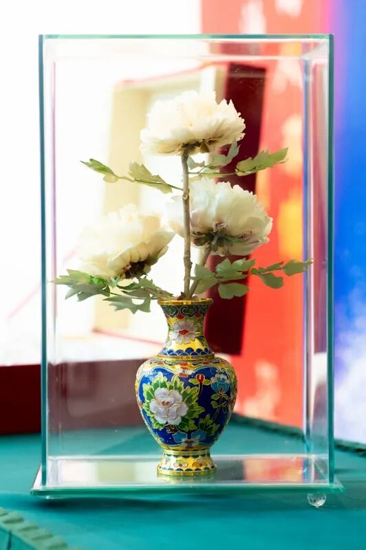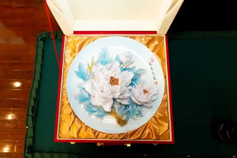 (“至善之美”以其独特的姿态和清雅色泽,诉说着大气、包容与豁达的情怀。一份清贫的牡丹瓷盘,和一份洛阳牡丹的永生花。)