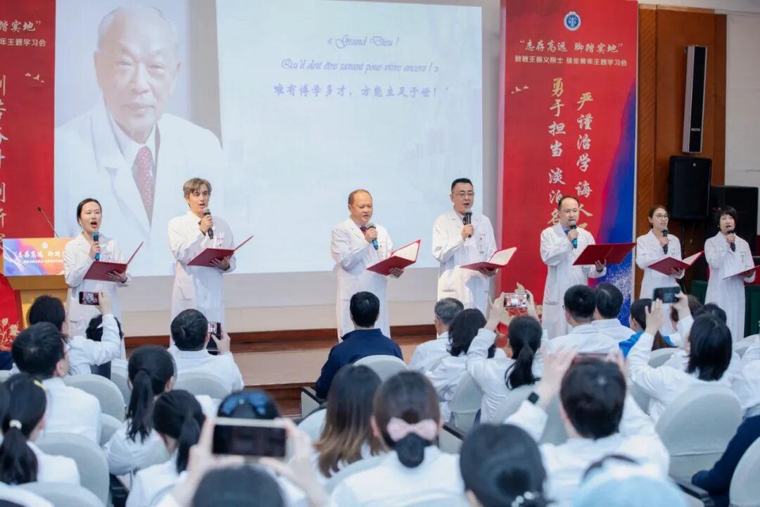 在活动的尾声,瑞金医院的医生代表带来了法语诗歌朗诵《一名医生》,并通过莫扎特的钢琴曲的旋律,表达对王院士的深深敬意。接着,三位医生演唱了法语歌曲《Belle》,用歌声表达对王振义院士的崇高敬意。