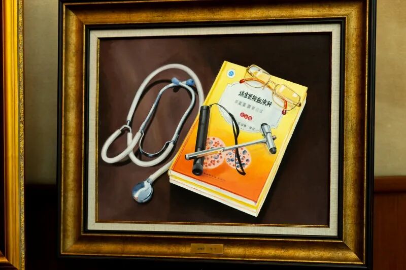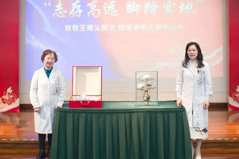 在精彩的分享后,瑞金医院党委书记瞿介明、瑞金医院终身教授陈赛娟共同为三幅致敬王院士的油画作品揭幕。为了致敬王振义院士,瑞金医院职工代表分别以王院士人物肖像、查房三件套(三件套:听诊器、叩诊锤、激光笔)以及象征传统与现代医学理念融合的金色DNA与大篆“义”字为主题,特别创作了三幅寓意深远的油画作品。随后,由陈赛娟院士、赵维莅副院长赠送百年寿辰礼物。
