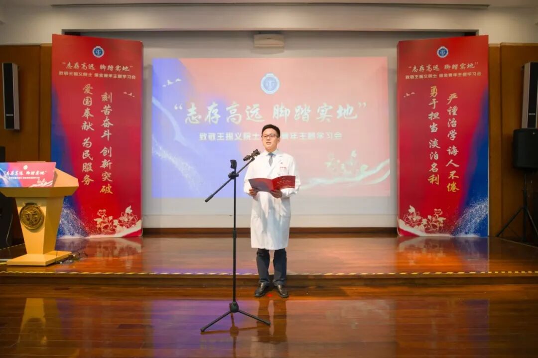 11月28日下午,瑞金医院举办了以“志存高远,脚踏实地”为主题的致敬王振义院士瑞金青年主题学习会。此次活动旨在深入学习王振义院士崇高的医德和卓越的医术,弘扬其大医精神,并激励瑞金青年医务工作者继承和发扬王院士的奋斗精神与无私奉献精神。出席大会的有院党政领导、职能部门负责人、医护青年及医学生代表等,现场活动同步线上直播,邀请全院及各分院青年共同参与学习。大会由胃肠外科蒋天宇医生与血液内科张慕晨医生共同主持。