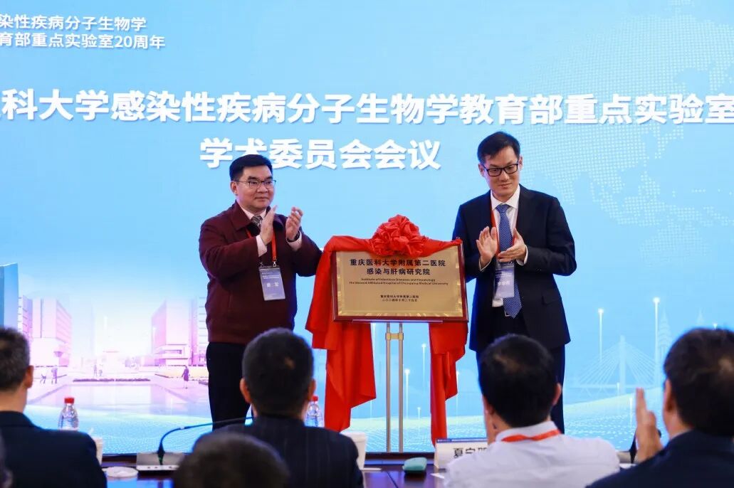 会议现场,举行了重庆医科大学附属第二医院感染与肝病研究院揭牌仪式。校党委常委、副校长李华兵,重庆医科大学附属第二医院党委书记袁军为研究院揭牌。
