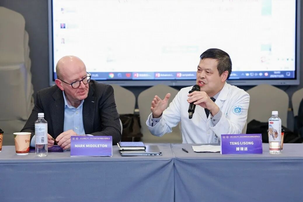 11月25日下午,Middleton教授团队至附属第一医院开展临床观摩研讨。附属第一医院肿瘤学科滕理送主任热情欢迎牛津团队的到来,并介绍了附属第一医院在上消化道肿瘤免疫治疗中的经验,及科室近年来在胃癌免疫和新辅助治疗临床研究的成果。其团队成员汇报了食管癌免疫/新辅助治疗/放疗和晚期胃癌免疫治疗的临床研究,以及特殊胃癌亚型的临床转化研究。牛津大学Middleton教授和姜石松教授分别作题为Building a multi-faceted translational research engine for Cancer(构建一个多层面的癌症转化研究引擎)和Cancer Vaccines: The next wave in Cancer immunology (肿瘤疫苗:肿瘤免疫治疗的下一波浪潮)的学术报告。双方进行了热烈讨论,并表达了强烈的合作意愿。会上,滕理送主任和Middleton教授还进行了“The Pathway to Becoming an Oncologist: A Comparison Between Oxford and China”对话,分别介绍了双方在培养肿瘤医生方面的经验,探讨牛津模式和浙大模式在培养青年医学人才方面各自的优势。