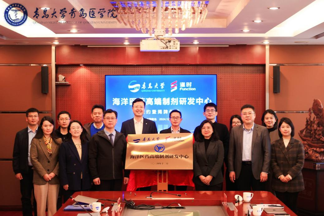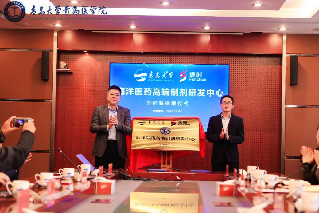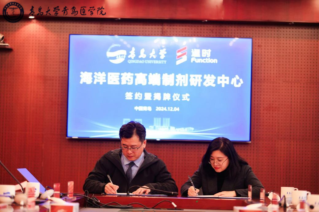 活动现场,牛海涛、刘晶代表双方签署“共建青岛大学逢时科技海洋医药高端制剂研发中心”合作协议,孙勇、邓学鹏共同为“青岛大学—逢时科技海洋医药高端制剂研发中心”揭牌。
