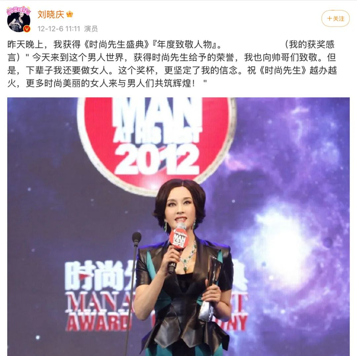 在颁奖礼上强调自己对时尚美丽的追求和对自我性别的强烈认同,大声喊出“下辈子我还要做女人”!