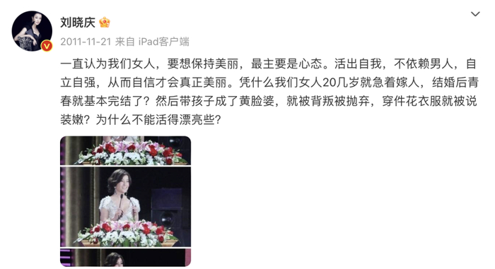 她用超前且slay的女王语录,展示自己对年龄羞耻的不屑态度,认为自己有责任永远“干干净净智慧得体”地展示生命的美丽,拥有“女人应有的生命尊严”。