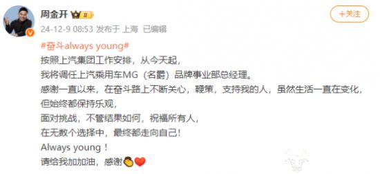 12月9日,上汽通用五菱原品牌与传播总经理周钘在社交平台上宣布,按照上汽集团工作安排,从今天起,他将调任上汽乘用车MG(名爵)品牌事业部总经理,引起了不小的关注。运营商财经网试图对他的职业履历进行揭秘。