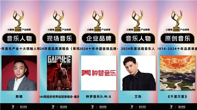 在刚刚过去的2024音乐财经十周年博览会上,种梦音乐D.M.G及旗下艺人也获评五项大奖。种梦音乐D.M.G荣获“2014-2024十年音娱品牌”,韩啸获评“十年音乐产业领袖人物”,《GAI进化论》2024演唱会-重庆站获评“2024年度十大品质演唱会单场”,艾热AIR荣获“2024年度说唱音乐人”,歌曲《千里万里》荣获“十年品质单曲”奖。