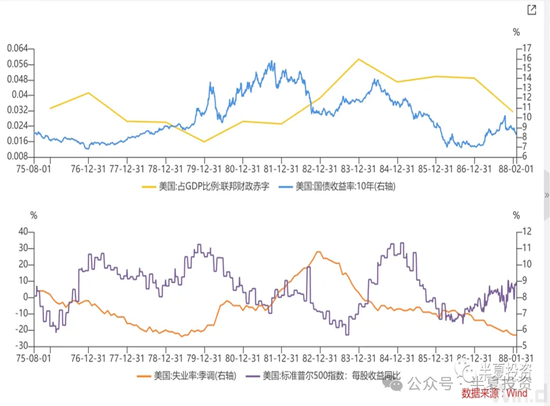 é‡Œæ ¹çš„ä»»æœŸæ˜¯80年到88å¹´ï¼Œä»–çš„ç¬¬ä¸€ä¸ªä»»æœŸå’Œç¬¬äºŒä¸ªä»»æœŸç»æµŽæ”¿ç–完全ä¸åŒã€‚他在第一个任期抛出了星çƒå¤§æˆ˜è®¡åˆ’,体现在财政上就是财政赤å—大幅上å‡äº†4个百分点。而他的第二任期,财政部长æ¢äººï¼Œä»–之å‰çš„ç»æµŽé¡¾é—®è´å…‹æˆä¸ºå½“时的财政部部长,为了解决高通胀,高贸易赤å—+高财政赤å—å¹¶å˜çš„é—®é¢˜ï¼Œæ•´ä¸ªæ”¿ç–æ€è·¯å‘生了éžå¸¸å¤§çš„å˜åŒ–。