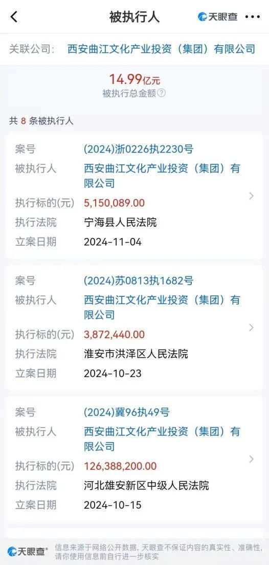 更何况,天眼查信息还显示,西安曲江文投集团有多条司法被执行信息,仅今年7月至11月被各地法院宣判执行的总金额高达近15亿元!给了这么多贷款,到时候会不会也出风险?
