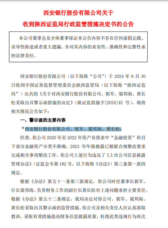 就在今年9月30日,西安银行以及前任董事长郭军、现任董事长时任行长梁邦海、副行长黄长松等一众高管被陕西省证监局出具了警示函的行政监管措施。