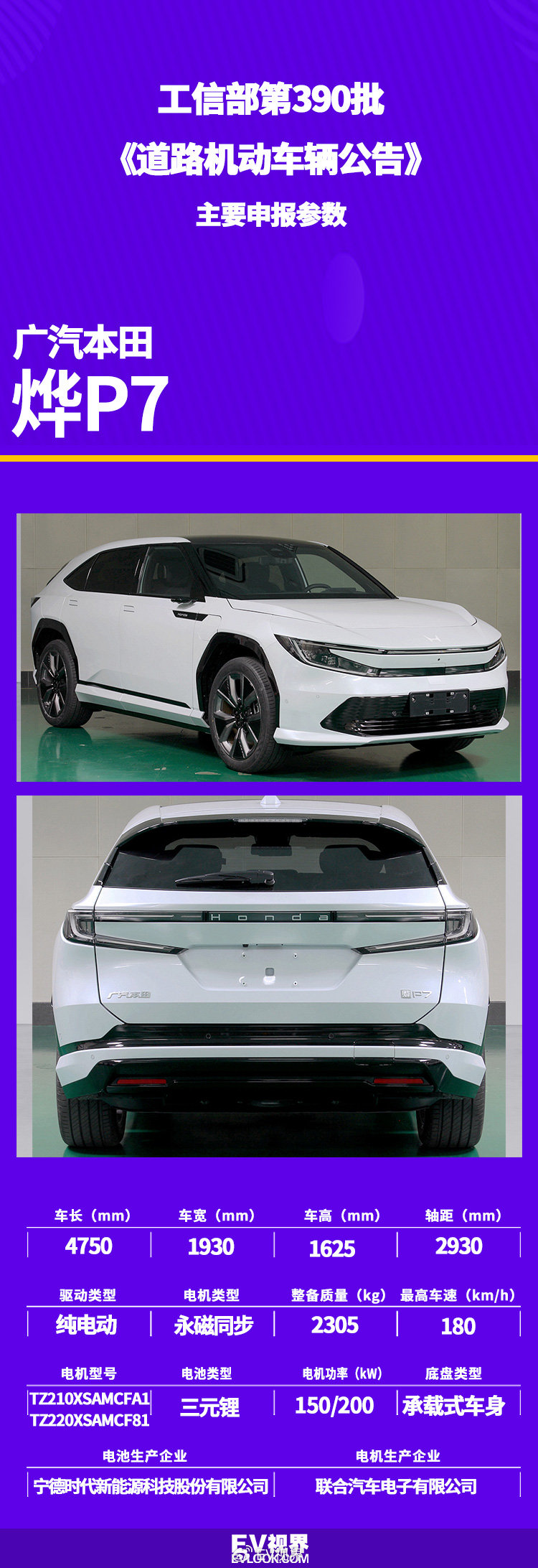 【EV视界报道】日前,工信部公示第390批《道路机动车辆生产企业及产品公告》,其中广汽本田烨P7在列。新车是采用全新纯电架构以及新架构的首款车,定位中型SUV,0-100km/h加速不到4.6s。