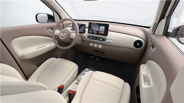 内饰方面,全新五菱宏光MINIEV四门版内饰采用双色搭配,配悬浮式的仪表盘和中控屏,采用电子旋钮式换挡,方向盘配备功能按键,并保留空调旋钮按键,二圆形的空调出风口看上去相当可爱。