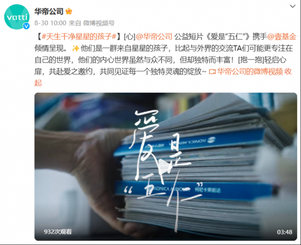 2005年至今,华帝通过“红领巾1+2”助学项目等公益项目,为困境中的儿童和青少年送去多重关爱。2024年8月,华帝携手壹基金共同启动「天生干净 星星的孩子」孤独症家庭守护计划,项目首期资助了14所“家长加油站”,帮扶对象覆盖700多个孤独症家庭。华帝董事长兼总裁潘叶江也以个人捐款的方式积极支持这一公益活动。同期拍摄的公益短片《爱是“五仁”》总曝光量超过2600万,有效吸引了更多社会力量加入到对这一特殊群体的关注和帮扶中。