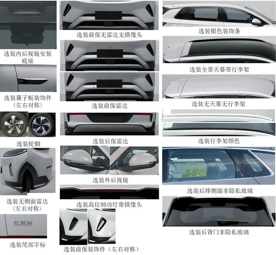 车辆提供多种选装配置,包括黑色装饰条、无天幕无行李架、高位制动灯带摄像头、后排侧面隐私玻璃及侧面雷达等。