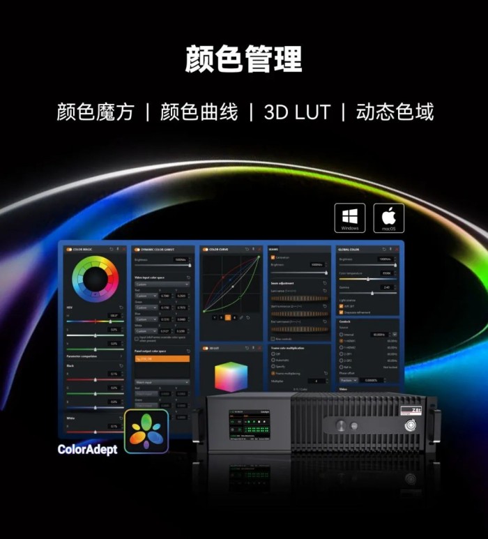 ColorAdept 系列(简称 CA 系列)基于全新的软硬件平台架构,为好莱坞影视制作工作室、电视台摄影制作等 VFX 虚拟拍摄领域,提供了强大的色彩管理解决方案。