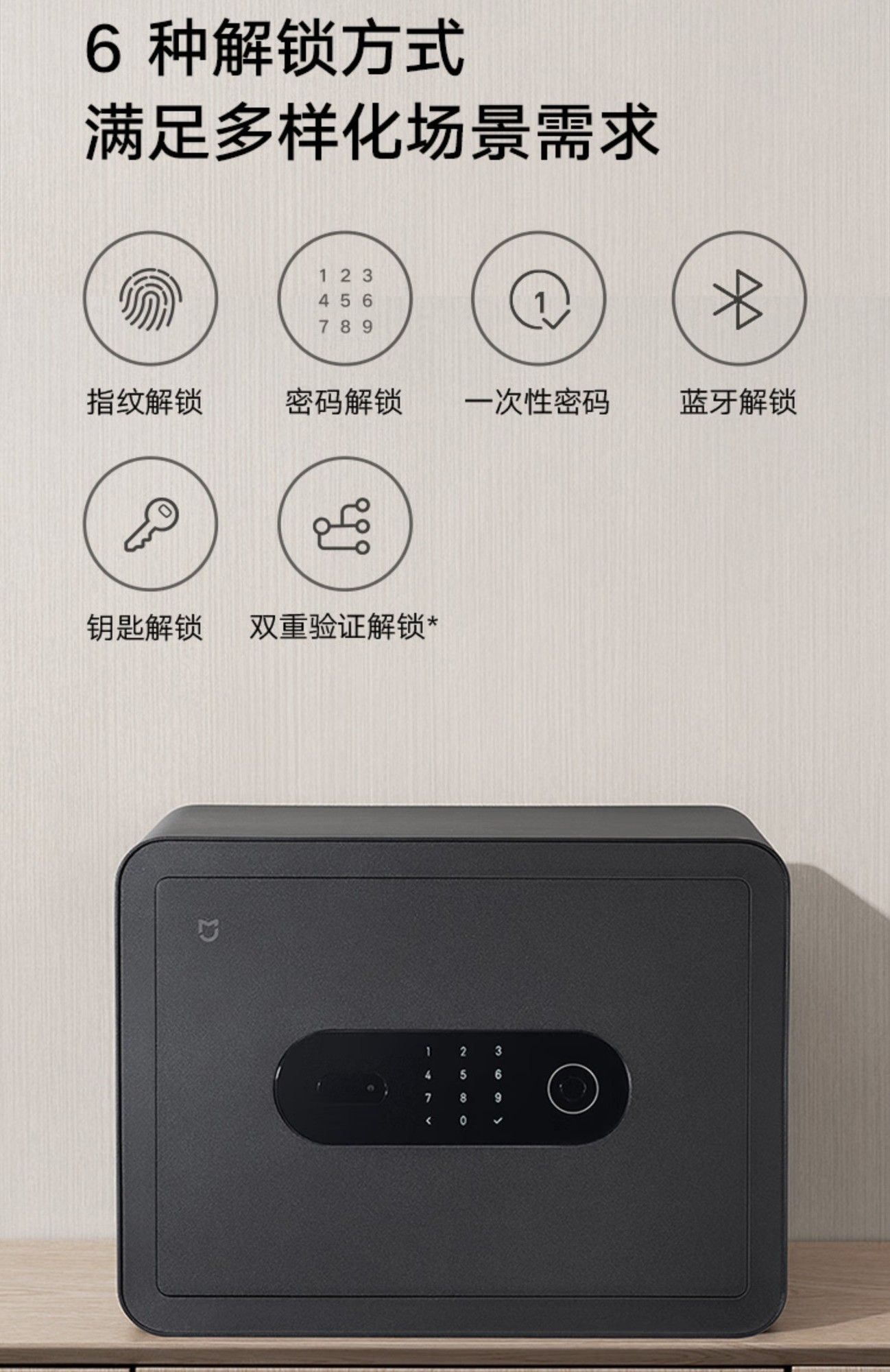 小米这款新品智能保险箱现在已经上市了,售价是699元。产品尺寸:300×400×300mm,重量约为15.5kg。支持指纹、密码、一次性密码、蓝牙、要是等多种解锁方式。保险箱设有固定安装孔,可以与墙面固定,还具备震动报警功能。这款新品轻推关门即可上锁,还具备低电量报警功能。