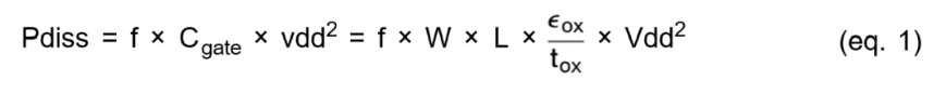 数字电路的标称电压为 2.5 V(厚栅极工艺)或 1.2 V(薄栅极工艺)。在 180 nm 节点上,标称电压分别为 3.3 V 和 1.8 V。下式表明,当 W、L、tox和 Vdd缩减时,数字功耗可以大大降低。(注意,调节tox具有相反的效果,但可通过调节尺寸和供电电压得到补偿)。特别是在 1.2 V 工艺流程中,Wmin和 Lmin显著缩小。因此,工作频率也有提高的空间。