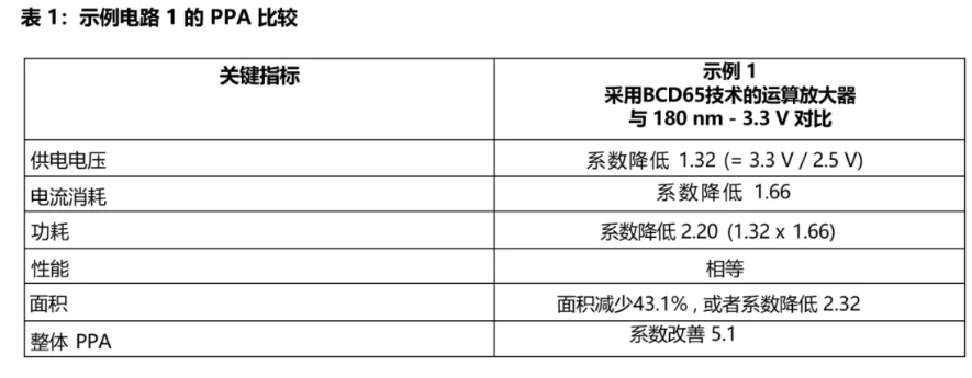 前文解释了为什么 Treo平台 65 nm BCD技术在功耗、性能和面积方面优于 180 nm - 3.3 V / 5 V 技术。列举了许多关于不同影响因素的定性说明。本节将根据实际电路示例说明 PPA 的具体改进。