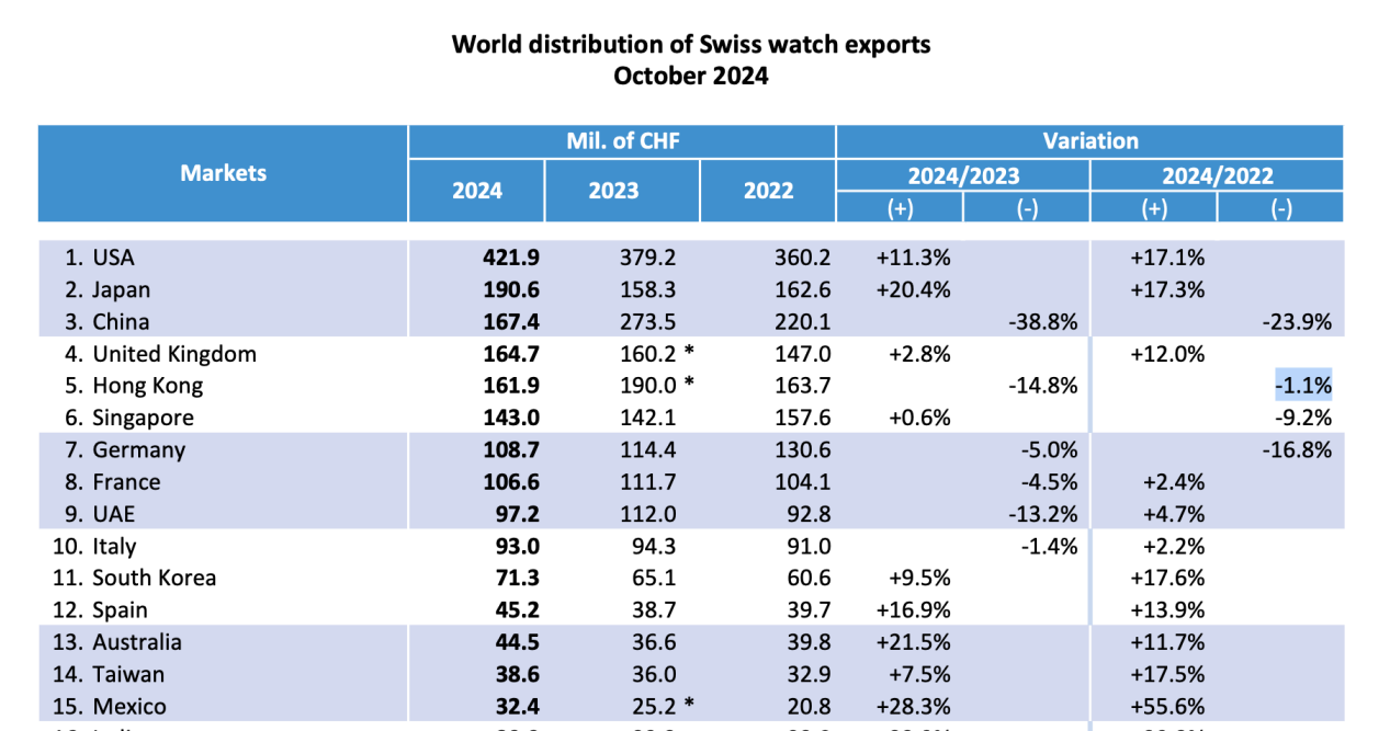 卖不动的不只是二手表。据瑞士钟表工业联合会披露,今年10月,瑞士腕表整体出口额同比下滑2.2%至23.43亿瑞士法郎(约等于人民币193.7亿元)。从出口目的地来看,瑞表对中国出口额跌势连连——中国内地和中国香港的瑞表出口额以38.8%和14.8%的同比降幅领跌。1月至10月,两地出口额同比下滑26.2%和19.8%。