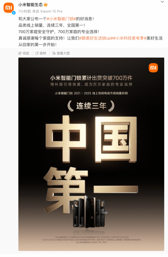 小米智能生态官方宣布,小米智能门锁的累积出货量已经突破700万件。这一数据是通过小米数据中心以及各大电商数据统计平台获取的,统计时间为2019年3月到2024年10月。根据洛图科技的数据显示,在2021年到2023年间,小米智能门锁系列产品在中国传统电商销量份额中排名第一。