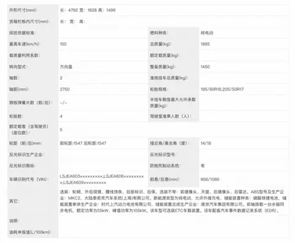 车身尺寸为4792/1828/1496毫米,轴距2750毫米,预计定位于纯电紧凑型车。