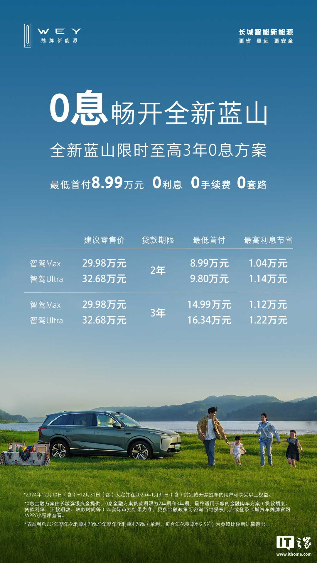 IT之家 12 月 10 日消息,长城旗下新能源品牌魏牌宣布,全新蓝山限时推出至高 3 年 0 息方案。