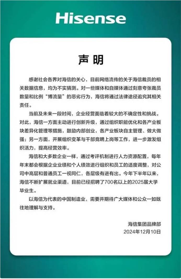 对此,海信集团官方发表声明,称这些关于裁员的数据和信息均为不实猜测,并对那些通过夸大裁员数量和比例以吸引流量的媒体和自媒体行为表示强烈谴责,明确表示将通过法律途径追究其责任。